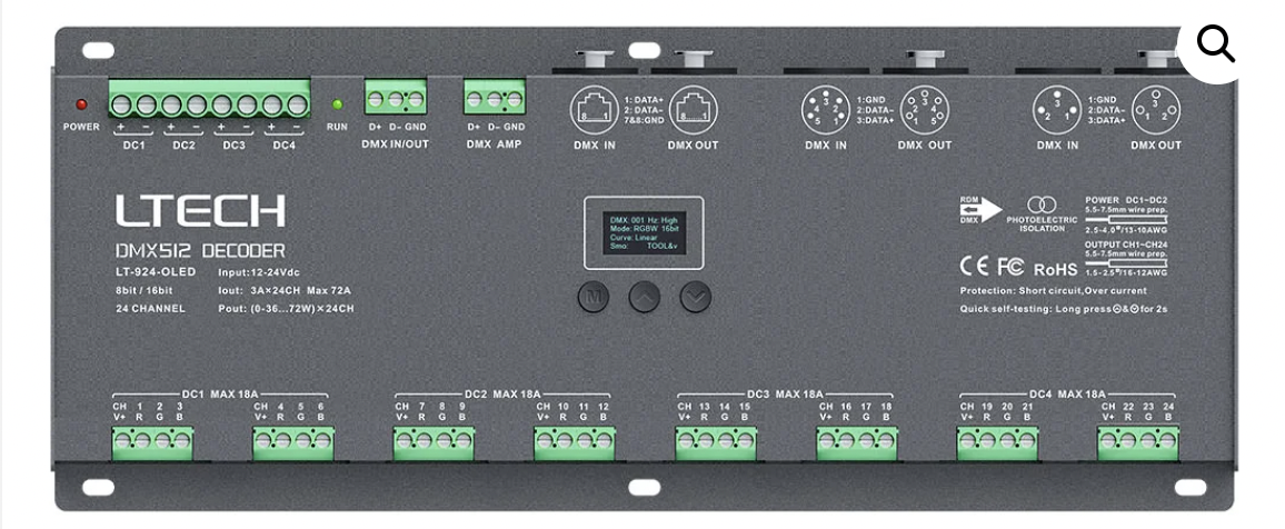 DMX decoder for low voltage circuits. With 24 output channels, this unit is ideal for controlling larger circuits of RGB, CT, or single colour LED Strip.